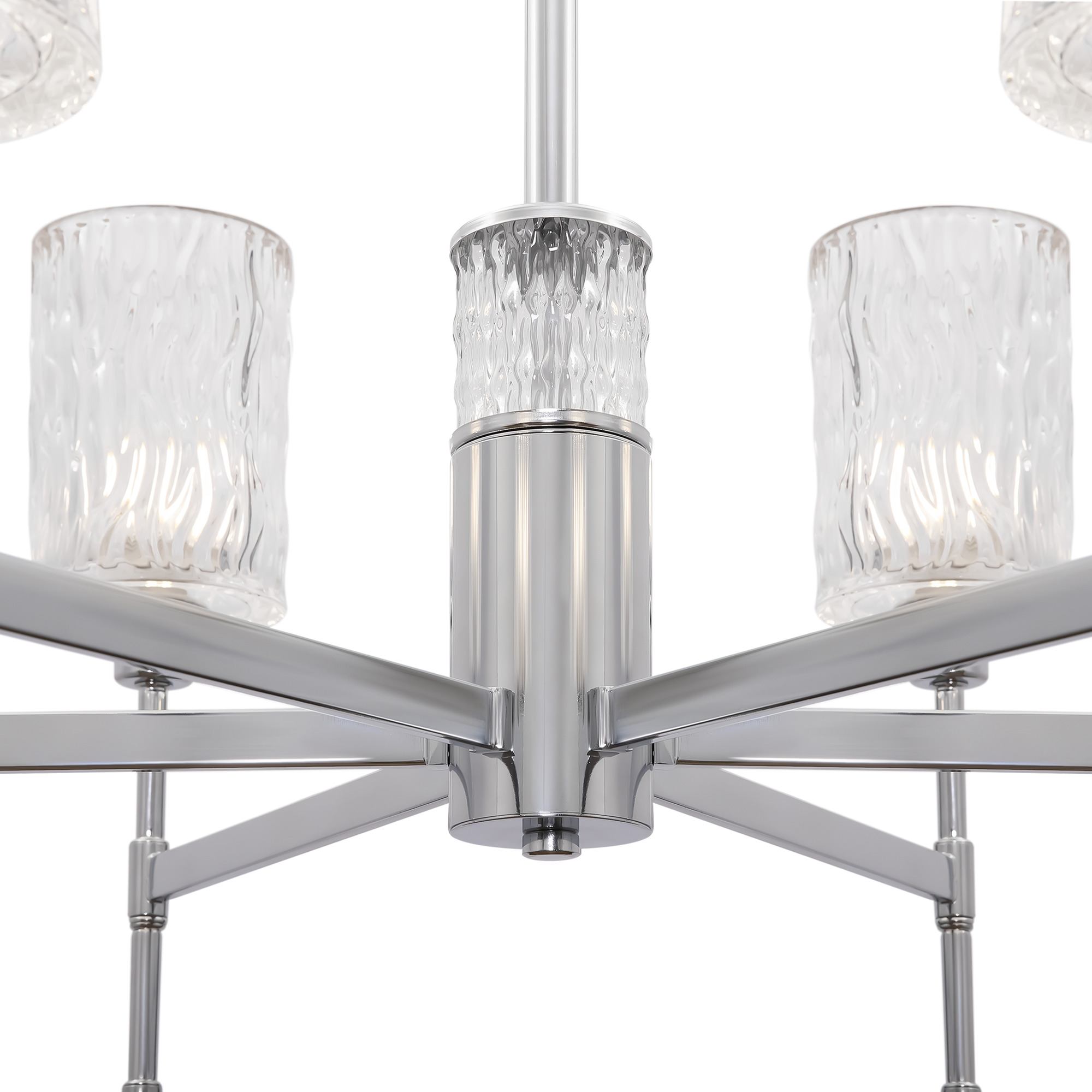 Хромированная металлическая арматура. Плафоны – фактурное прозрачное стекло. В качестве источника света используется лампа с цоколем Е14.