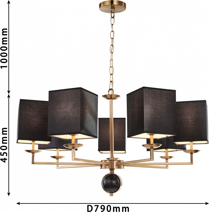 Металлический каркас в цвете античная латунь, плафоны из черной ткани, декор - имитация черного мрамора, каркас можно монтировать как вверх, так и вниз плафонами. Коллекция Diva выполнена в двух цветах на выбор — хром или античная латунь. Плафоны квадратной формы, обтянутые белой или черной тканью, гармонично дополняют рожки, которые выполнены из квадратного профиля и имеют прямой угол сгиба. Центральный декоративный элемент выполнен в технике мраморирования. Люстры оснащены системой 2в1, которая позволяет монтировать люстры как вверх, так и вниз плафонами.